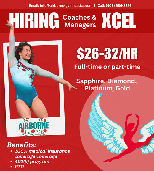 Airborne Gymnastics in sunny California is looking for enthusiastic, competitive team coaches! We are looking for motivated coaches who want to join our award-winning program! We strive to hire positive role models who want to instill discipline and love of gymnastics in our athletes.